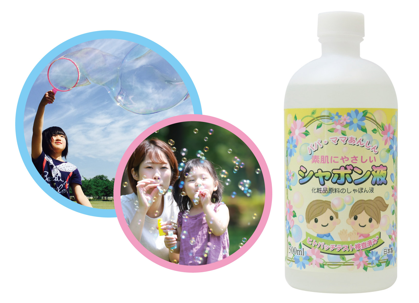 当該商品は玩具安全基準をクリアしたしゃぼん液でしたが、頂いたお声から『刺激に弱い敏感肌の方でもしゃぼん玉あそびを楽しめるしゃぼん液が必要』と考え、『肌に触れても安全な素材』を目指して、国内の化粧品工場に開発協力を依頼しました。そして出来上がったのが、ヒトパッチテストによる皮膚アレルギー検査をクリアした『素肌にやさしいしゃぼん液』です。おかげさまで完成した商品は、現在多くのお客様にご好評を頂いています。